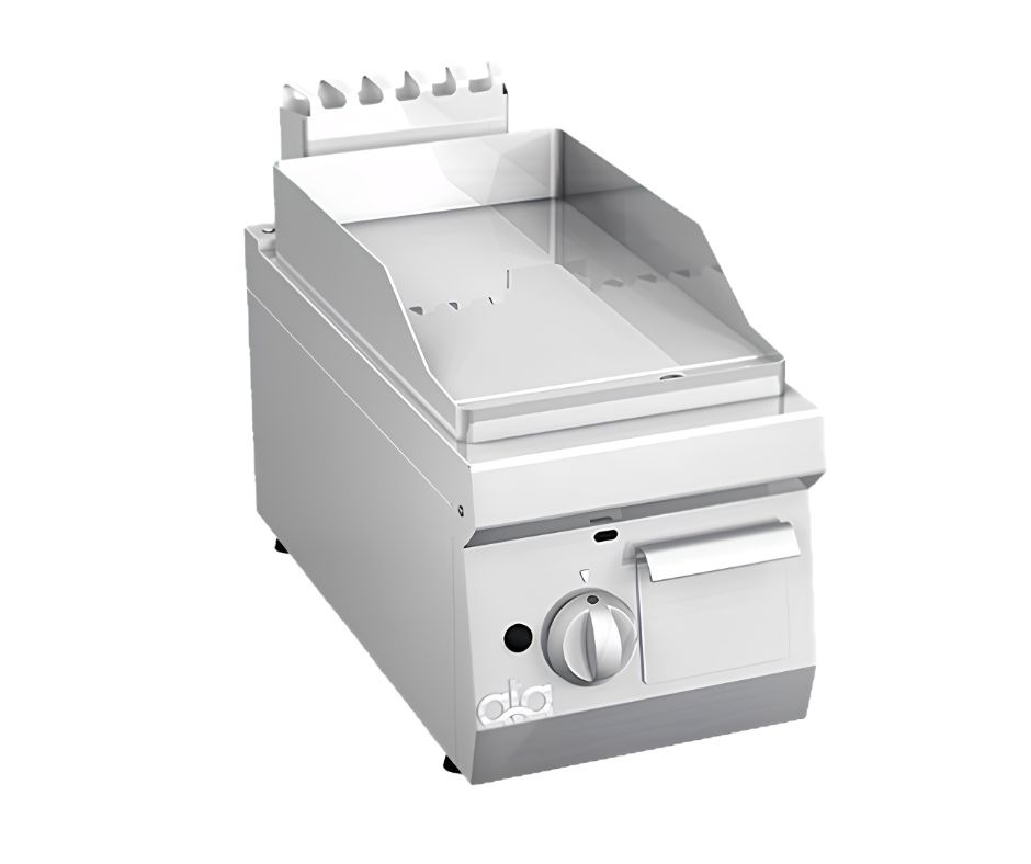 Surface de cuisson épaisse à coins ronds avec protection soudée contre les éclaboussures pour un nettoyage facile. Plaque de cuisson légèrement inclinée vers l’évacuation des graisses, qui est reliée à un récipient situé sous le plan de travail. Équipée en standard d’un récipient d’évacuation des graisses.
