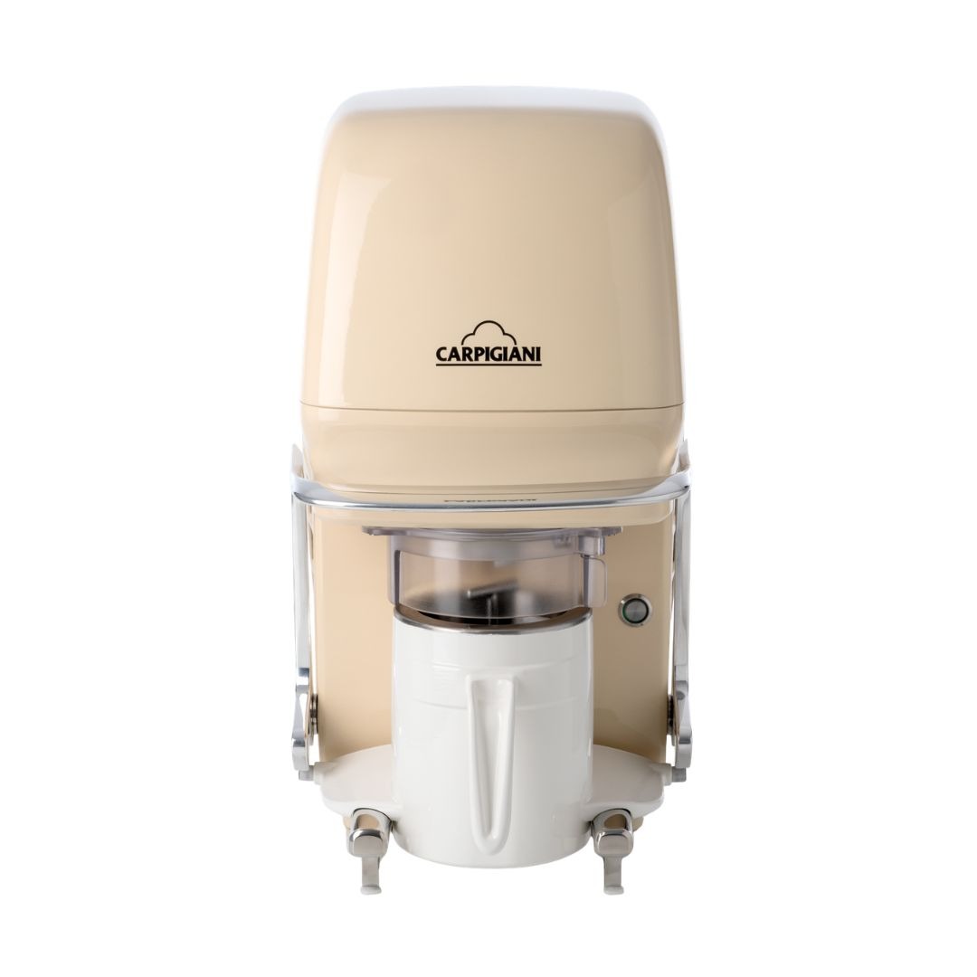 Un seul cylindre pour turbiner, conserver et servir la crème glacée. Il s’installe en un seul geste, en insérant la fiche dans la prise de courant. Il est possible de produire jusqu’à 5 kg de crème glacée en une heure.